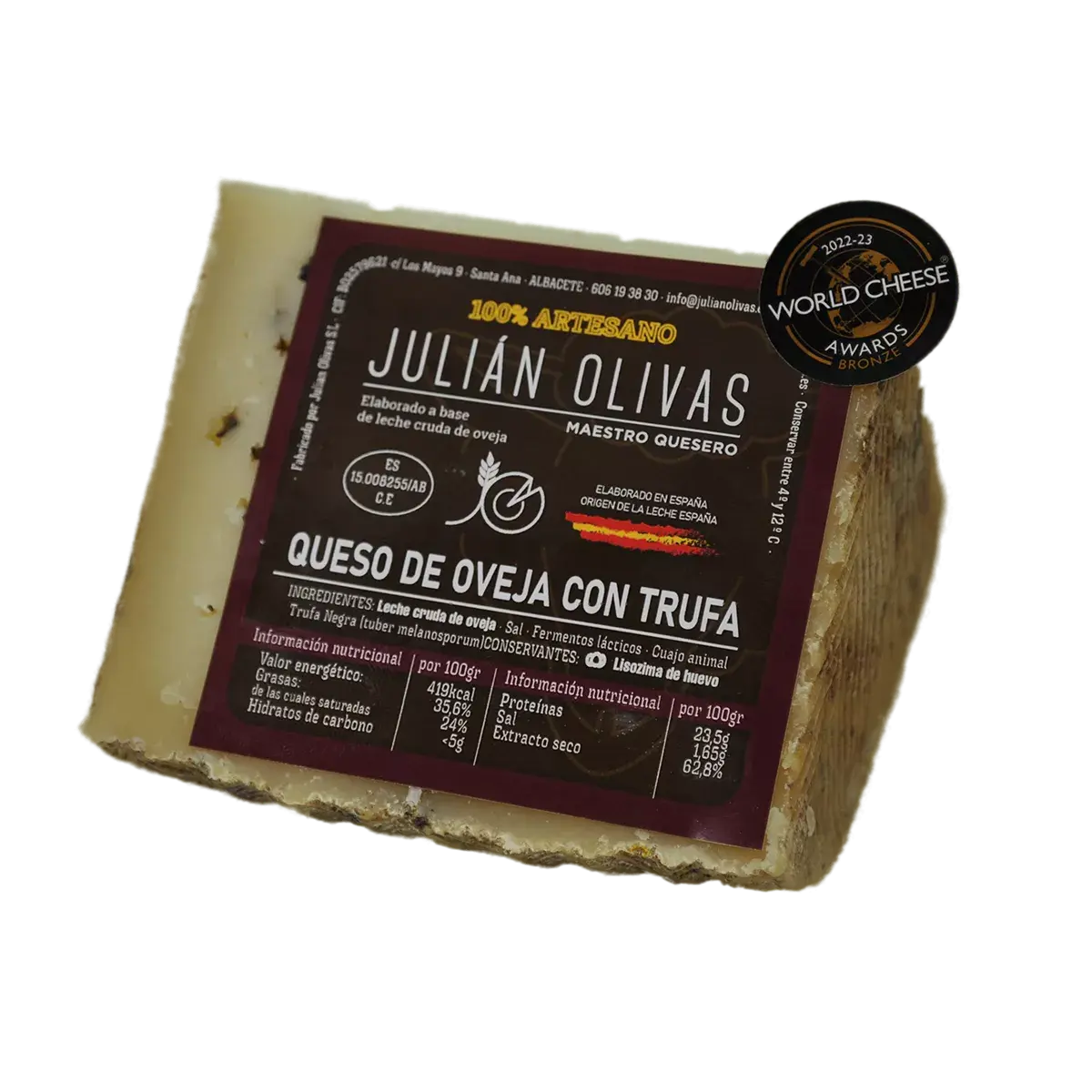 Ingredientes: Elaborado a base de leche cruda de oveja, sal, fermentos lácteos, cuajo animal y trufa negra ( tuber melanosporum )